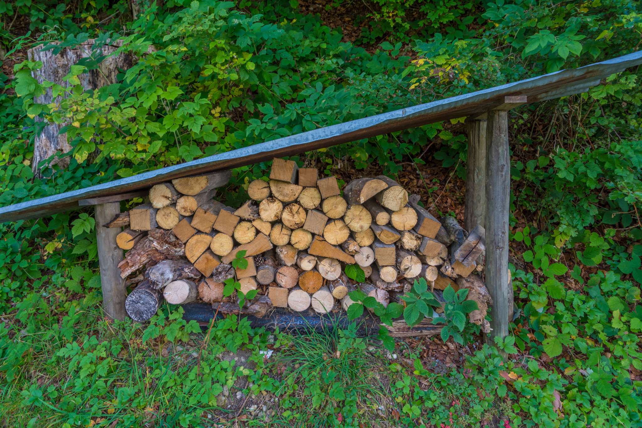 Lauschiger Grillplatz mit Holz und Bänken.
